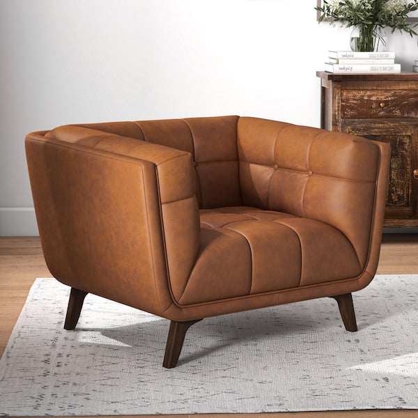 Allen Mid-Century Cognac Tufted Tight Back Genuine Leather Upholstered Armchair