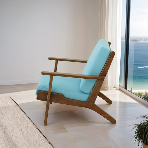 Kalley Mid-Century Modern Cushion Back Solid Wood Armchair in Sky Blue Linen