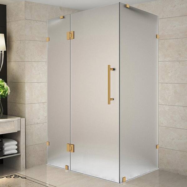 Avalux 45 in. x 32 in. x 72 in. Rectangular Pivot Frameless Corner Shower Enclosure in Brushed Gold with Frosted Glass