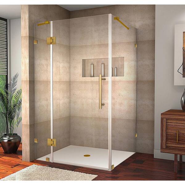 Avalux 57 in. x 38 in. x 72 in. Rectangular Pivot Frameless Corner Shower Enclosure in Brushed Gold with Clear Glass