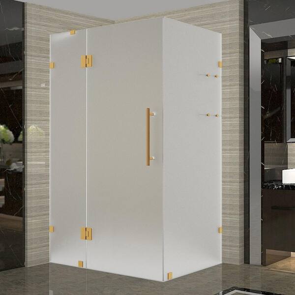 Avalux GS 48 in. x 38 in. x72 in. Rectangular Pivot Frameless Corner Shower Enclosure in Brushed Gold with Frosted Glass