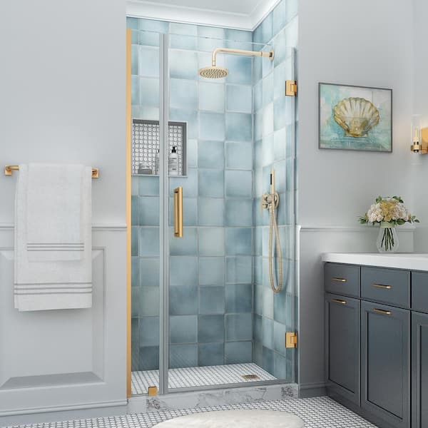 Belmore XL 32.25 - 33.25 in. W x 80 in. H Frameless Hinged Shower Door with Clear StarCast Glass in Brushed Gold