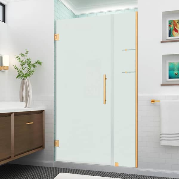 BelmoreGS 38.25 to 39.25 in. W x 72 in. H Frameless Hinged Shower Door, Frosted Glass and Glass Shelves in Brushed Gold