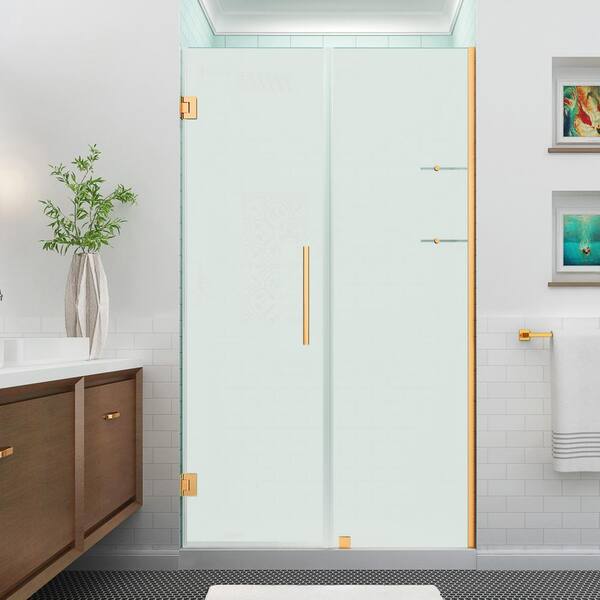 BelmoreGS 44.25 to 45.25 in. W x 72 in. H Frameless Hinged Shower Door, Frosted Glass and Glass Shelves in Brushed Gold