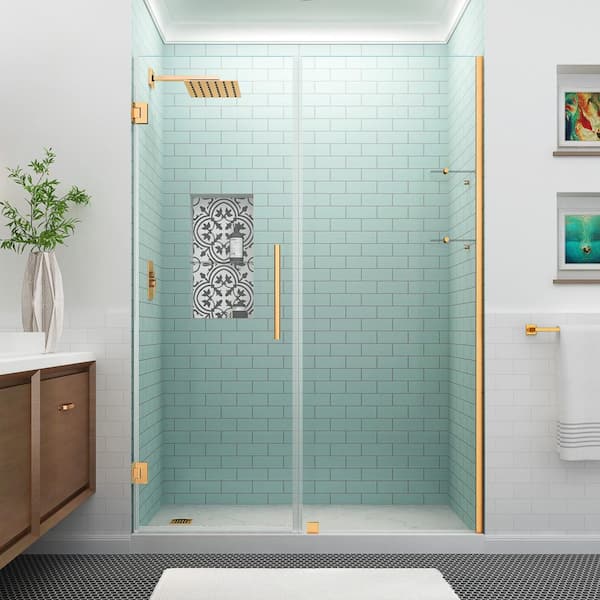 BelmoreGS 61.25 in. to 62.25 in. W x 72 in. H Frameless Hinged Shower Door with Glass Shelves in Brushed Gold