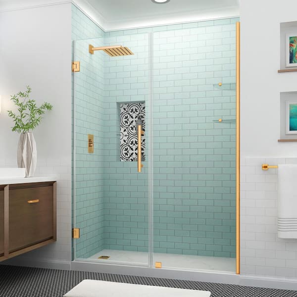 BelmoreGS 64.25 in. to 65.25 in. W x 72 in. H Frameless Hinged Shower Door with Glass Shelves in Brushed Gold
