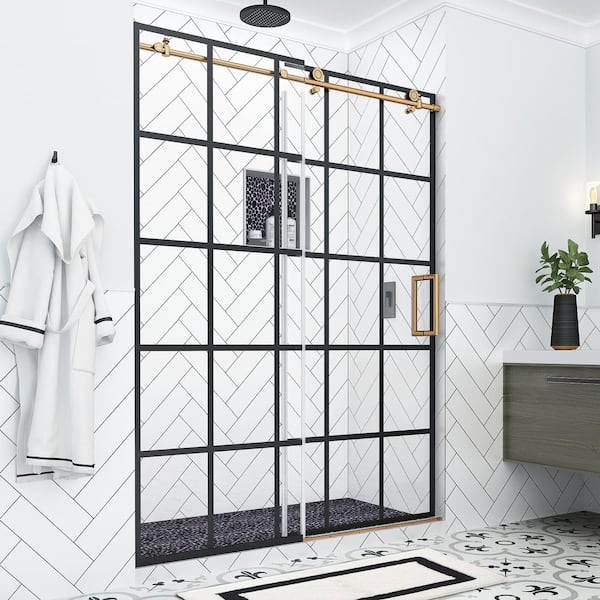 Kamaya XL 60 - 64 in. W x 80 in. H Sliding Frameless Shower Door in Black & Brushed Gold Finish with Clear Glass, Right