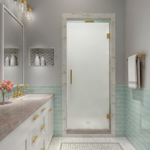 Kinkade XL 25.25 in. - 25.75 in. x 80 in. Frameless Hinged Shower Door with Ultra-Bright Frosted Glass in Brushed Gold