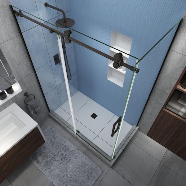 Langham XL 44 in. - 48 in. x 38 in. x 80 in. Sliding Frameless Shower Enclosure, StarCast Clear Glass in Bronze, Right