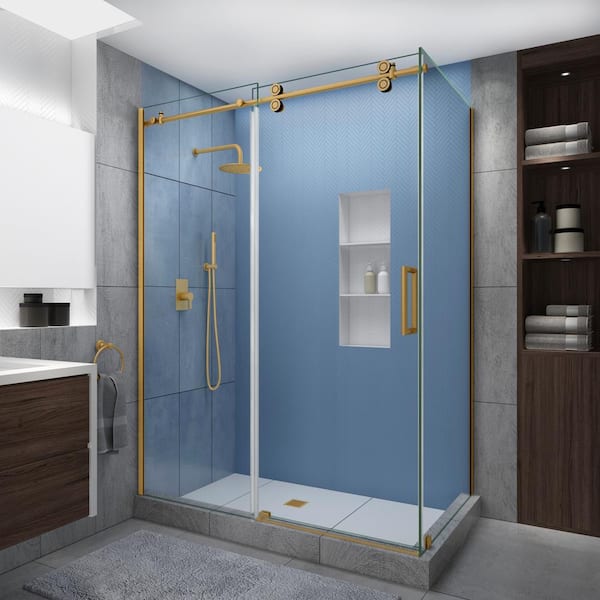 Langham XL 48-52 in. x 36 in. x 80 in. Sliding Frameless Shower Enclosure StarCast Clear Glass in Brushed Gold Right