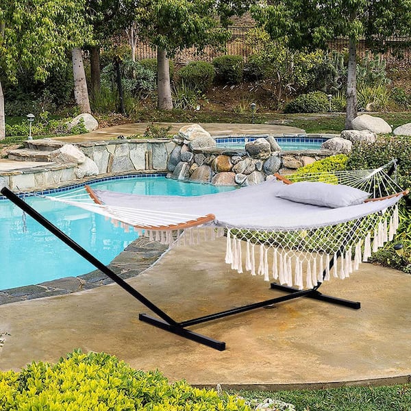 12 ft. Hammock with Stand Included, Double Fabric Hammock with Curved Spreader Bar& Decorative Tassels, Blue Pattern