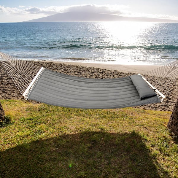 2 ft. to 15 ft. Quilted Double 2-Person Hammock with Hardwood Spreader Bar and Pillow in Light Gray