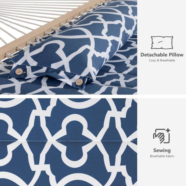 Double Hammock Quilted Fabric Swing with Spreader Bar, Detachable Pillow, 55 in. x 79 in. Large Hammock, Blue Pattern