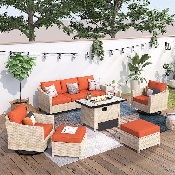 Athenie Biege 7-Piece Wicker Patio Rectangle Fire Pit Conversation Set with Orange Red Cushions and Swivel Chairs
