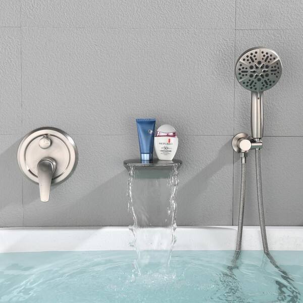 Lilac Single-Handle Wall Mount Roman Tub Faucet with 7-Spray Round Hand Shower in Brushed Nickel (Valve Included)