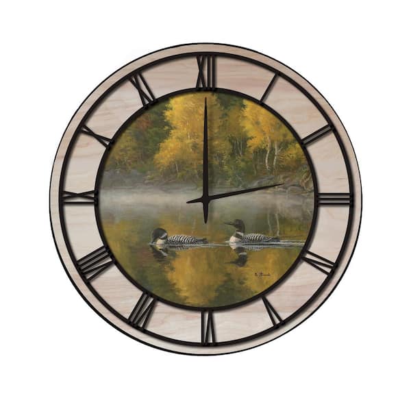 "Autumn Morning Shoreline" Woodgrain Accent and Black Numbers Imaged Wall Clock
