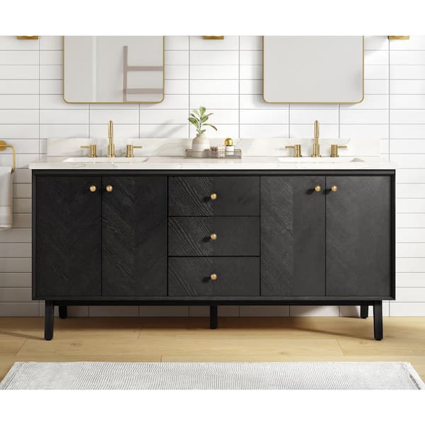 • 72-in W x 21-in D x 34-in H black oak vanity with gold knobs