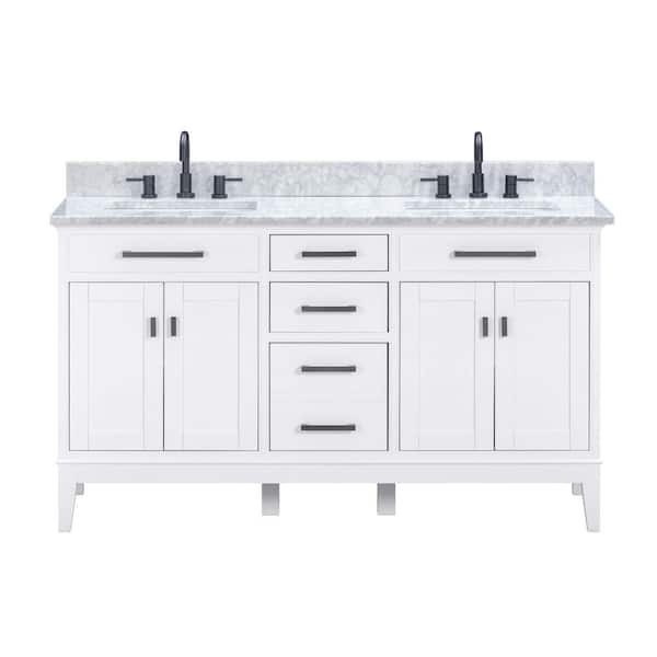 Madison 61 in. Double Sink White Bath Vanity with Carrara White Marble Top