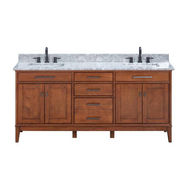 Madison 73 in. Double Sink Tobacco Bath Vanity with Carrara White Marble Top