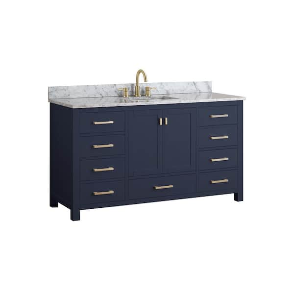 Modero 61 in. Single Sink Navy Blue Bath Vanity with Carrara White Marble Top