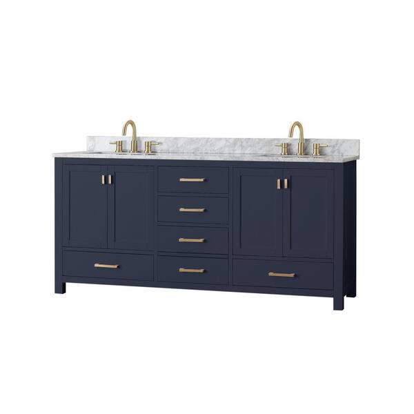 Modero 73 in. Double Sink Navy Blue Bath Vanity with Carrara White Marble Top