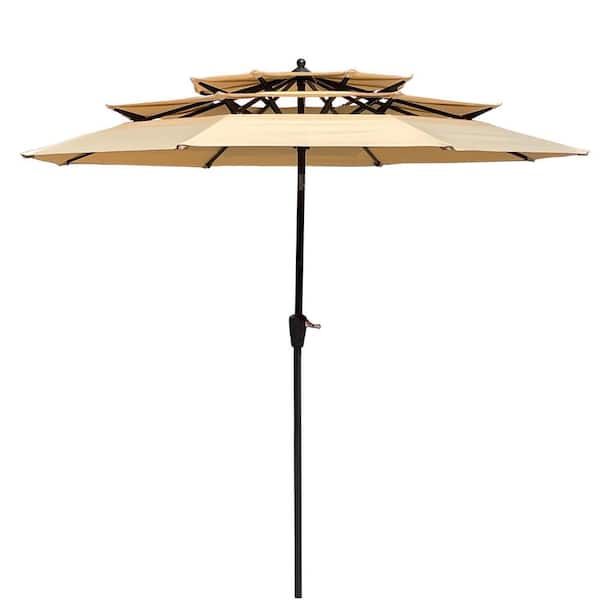 CoolSum 9 ft. Steel Push-Up Three-Layer Patio Umbrella in Tan with Crank, Tilt and Wind Vents, UV-Resistant