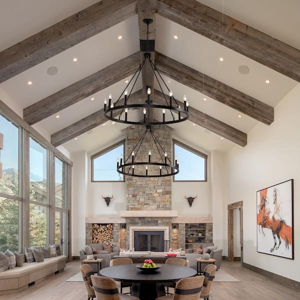 12-Light Wagon Wheel Chandelier, 31 in. Black Round Chandeliers Outdoor Porch Light Fixtures