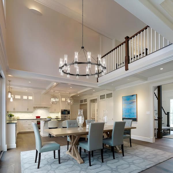 12 Lights Wagon Wheel Chandelier with Glass Shade, 43. 3 in. Black Modern Farmhouse Chandelier for Dining Room Entryways