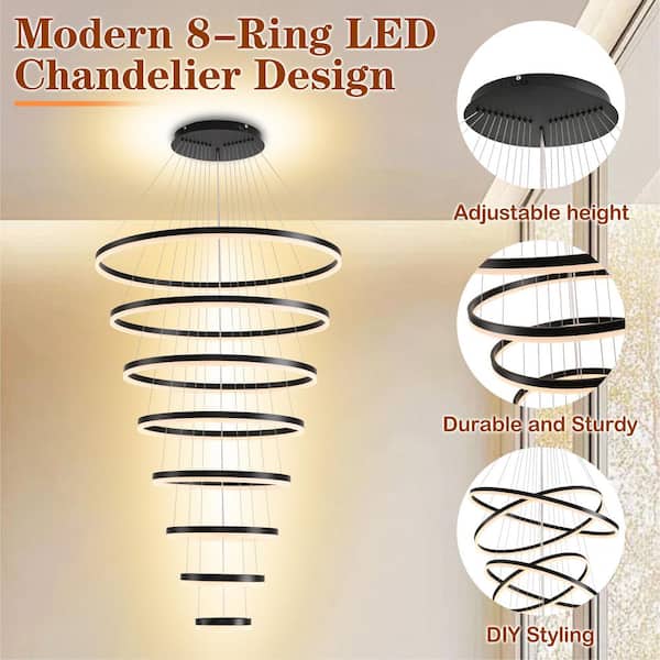 Modern Chandelier, 8 Ring Dimmable Integrated LED Black Chandelier for High Ceiling Chandelier for Entryway
