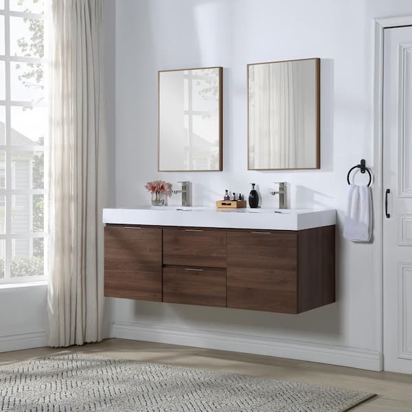58.6 in. W x 19.6 in. D x 20.1 in. H Double Floating Bath Vanity in Oak with White Resin Top