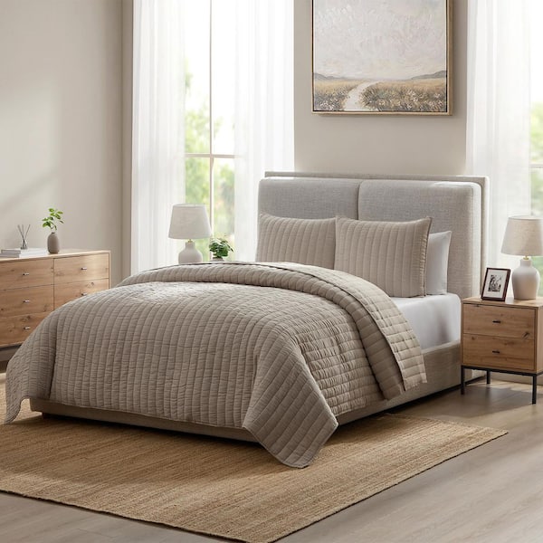DI Stripe 3-Piece Poly Cotton Blend Gauze Quilt Set Full/Queen 90 in. x 96 in. Taupe