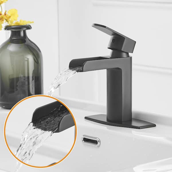 Waterfall Single-Handle Single Hole Drip-Free Bathroom Faucet with Supply Hose and Deckplate in Matte Black
