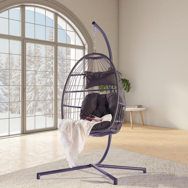 Patio Wicker Porch Swing Chair Folding Hanging Outdoor Chair with Pillow and Stand