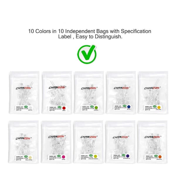 100 Pcs 5mm Specialty Code T1 LED Diode Light, 25 Wattage Equivalence 10 Color Emitting Lighting Bulb Lamp Assorted Kit