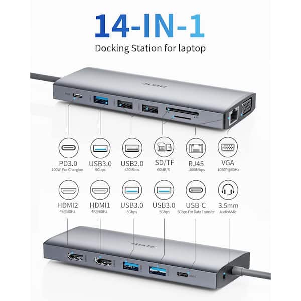 14-in-1 USB C Laptop Docking Station Dual HDMI 4K@60Hz Triple Monitor Support 100W PD Aluminum Cooling Hub