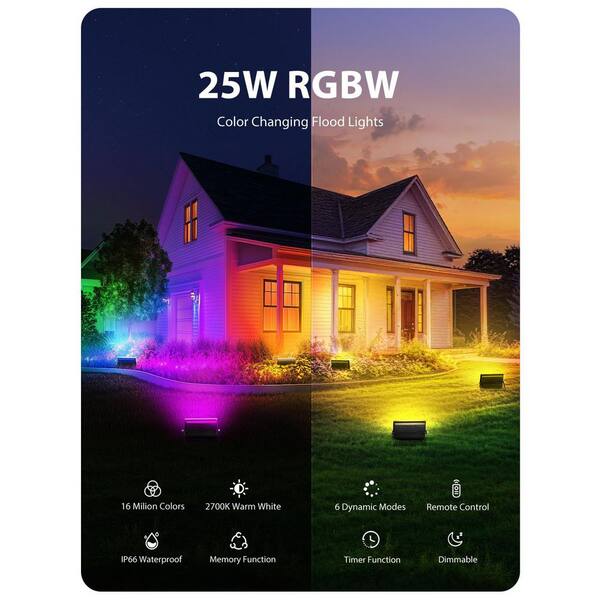 (4 Pack)25W Black Hardwired Color Changing Integrated LED RGB Landscape Flood Light 2700K Warm White IP66 Stage Lighting
