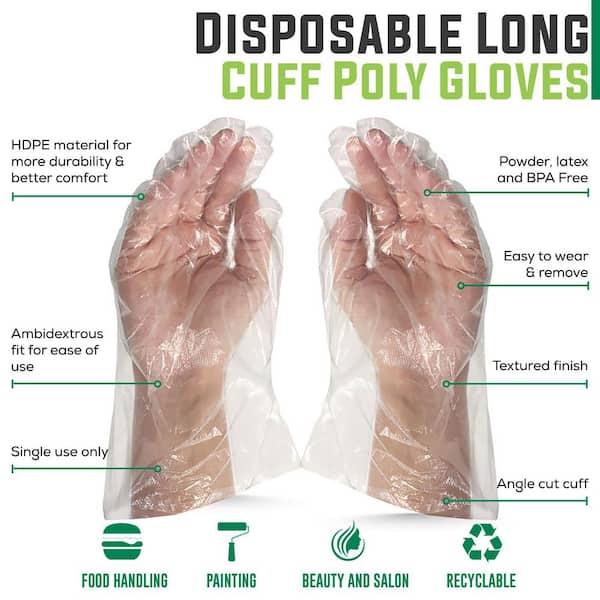 1 Size Fits Most, Disposable Food Handling Long Cuff Poly Gloves (525/Box, 2-Pack)