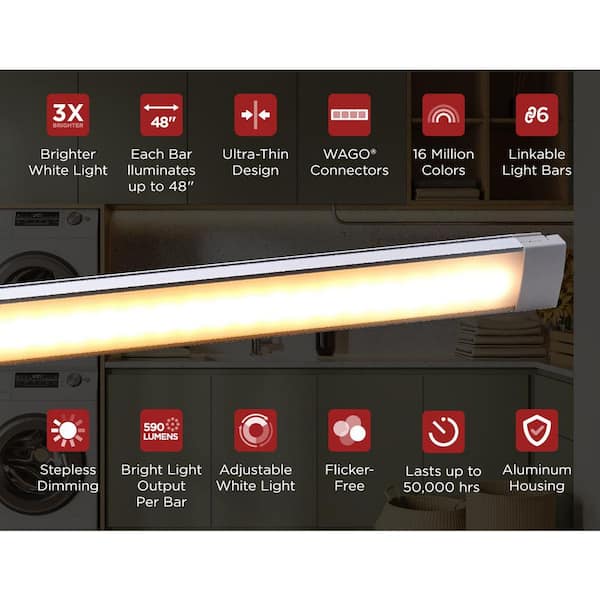 PUSH WIRE 24 in. Bar,.98 in. Plug-in or Hardwire Compatible, White & RGB Integrated LED, Silver, Under Cabinet Light Bar