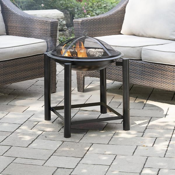 21.5 in. Round Steel Wood Fire Pit On Raised 4-Post Platform with Screen, Screen Lift, And Log Grate