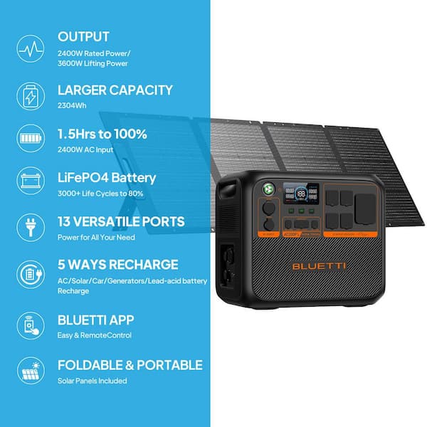 2400/3600-Watt Continuous Peak Output Power Station AC200PL Push Button Start LiFePO4 Battery Generator/200W Solar Panel