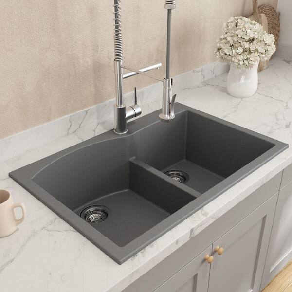 Campino Duo Concrete Gray Granite Composite 33 in. 60/40 Double Bowl Drop-In/Undermount Kitchen Sink with Strainers