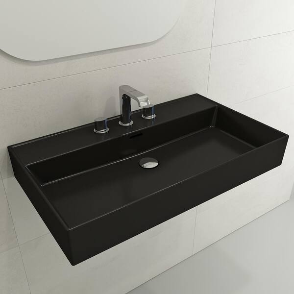 Milano Wall-Mounted Matte Black Fireclay Rectangular Bathroom Sink 32 in. 3-Hole with Overflow