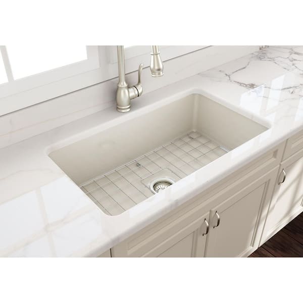Sotto Undermount Fireclay 32 in. Single Bowl Kitchen Sink with Bottom Grid and Strainer in Biscuit