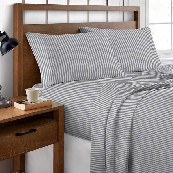 Printed Cotton Sheet Set, Chambray Stripe Light Blue-Queen