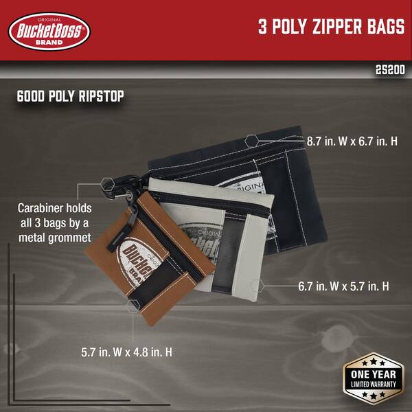 • Includes 3 multi-sized tool zipper top tool bag for tool storage