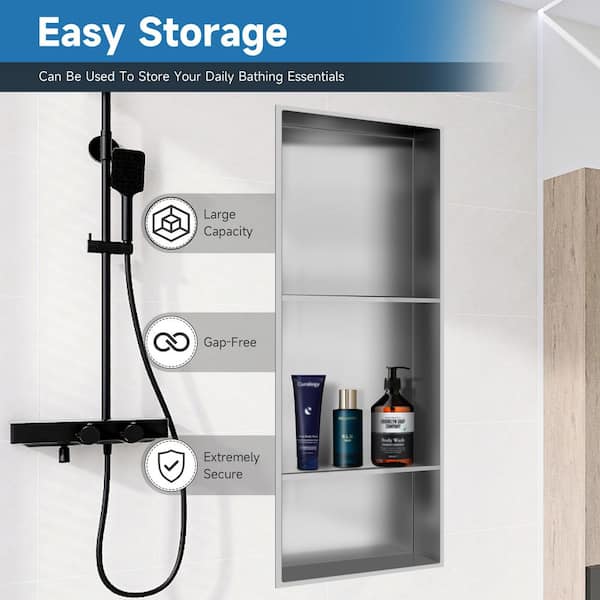 13 in. W x 31 in. H x 4 in. D Bathroom Shower Niche Double Shelf Niche Over Mount Installation in Brushed Nickel