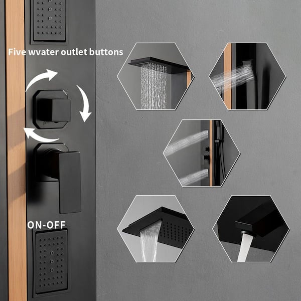 2-Jet Rainfall Shower Panel System with Rainfall Waterfall Shower Head and Shower Wand in Black Bamboo