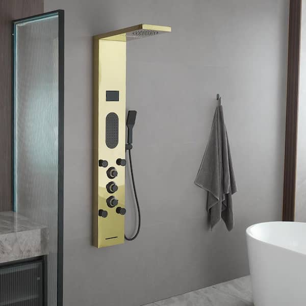 5-Jet Rainfall Shower Panel System with Rainfall Shower Head and Shower Wand Shower Tower With LED Light in Black Gold