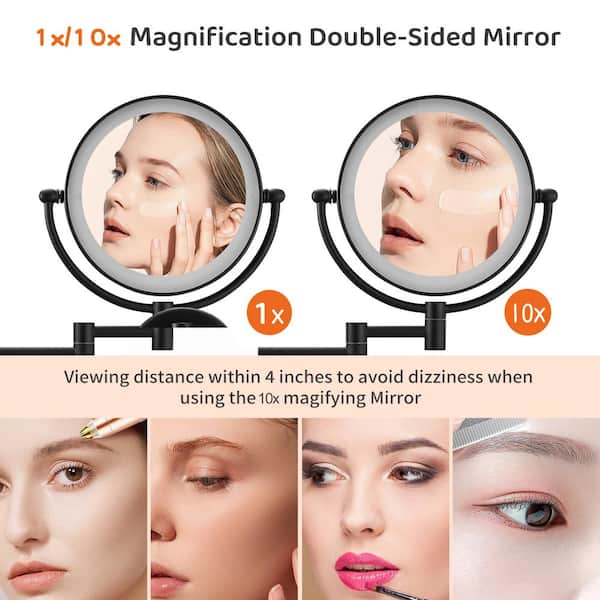 8 in. W x 8 in. H Round LED Lighted Wall Mount Bi-View 1X/10X Magnification Hardwired Bathroom Makeup Mirror in Black