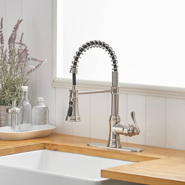 Single Handle 3 Spray High Arc Pull Down Sprayer Kitchen Faucet With Deck Plate in Brushed Nickel